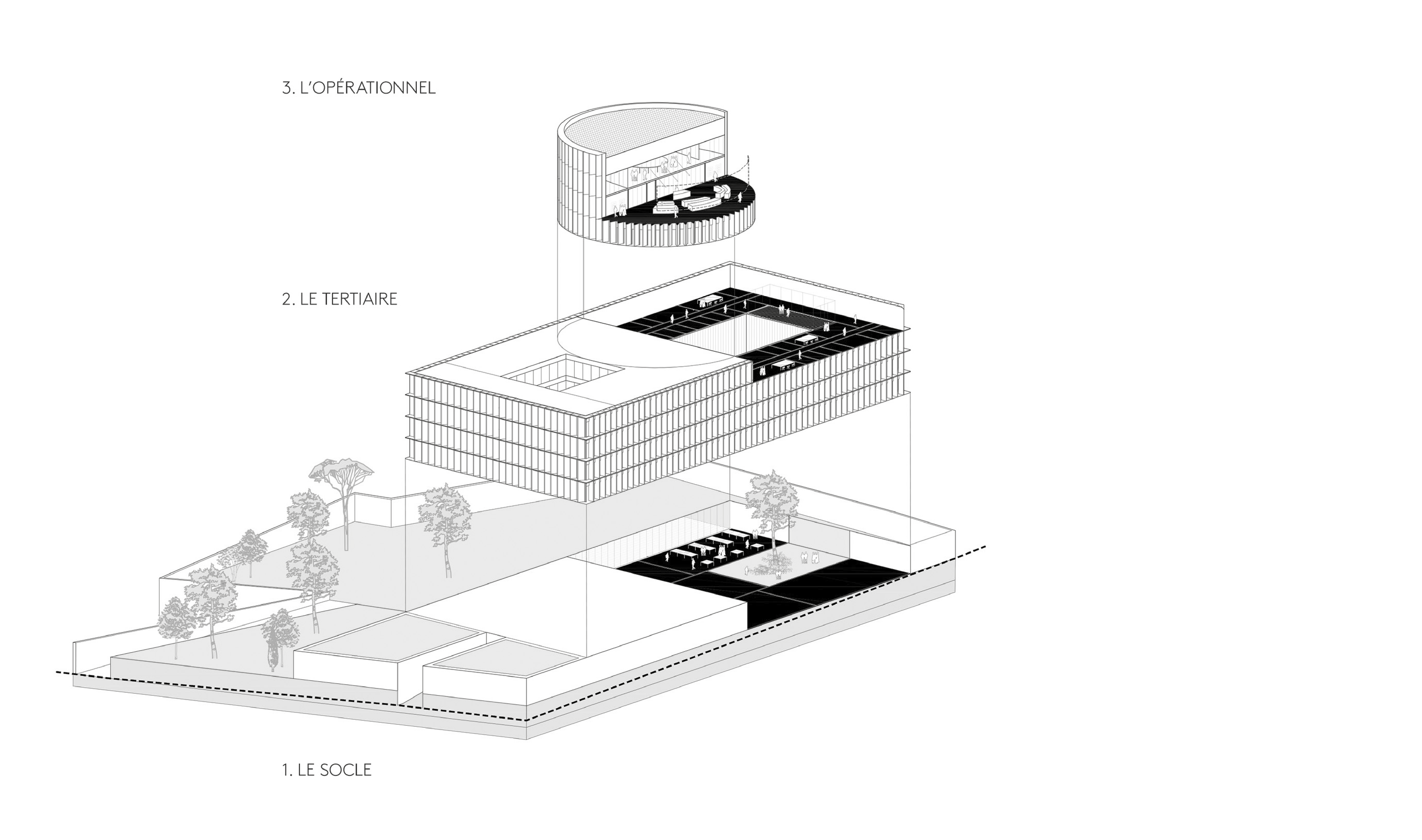 Assumer l’importance de l’accès automobile, des besoins d’intervention et du stationnement sans transformer la parcelle en simple parking. Être un signal iconique et proposer une architecture porteuse de sens, tout en évitant les gesticulations superflues et passéistes. Il s’agit donc de concevoir une architecture qui, par sa lisibilité et sa clarté,traduira en espace les idées de simultanéité des situations et des contextes, montrant qu’il est possible de poursuivre plusieurs objectifs à la fois, même s’ils semblent éloignés.