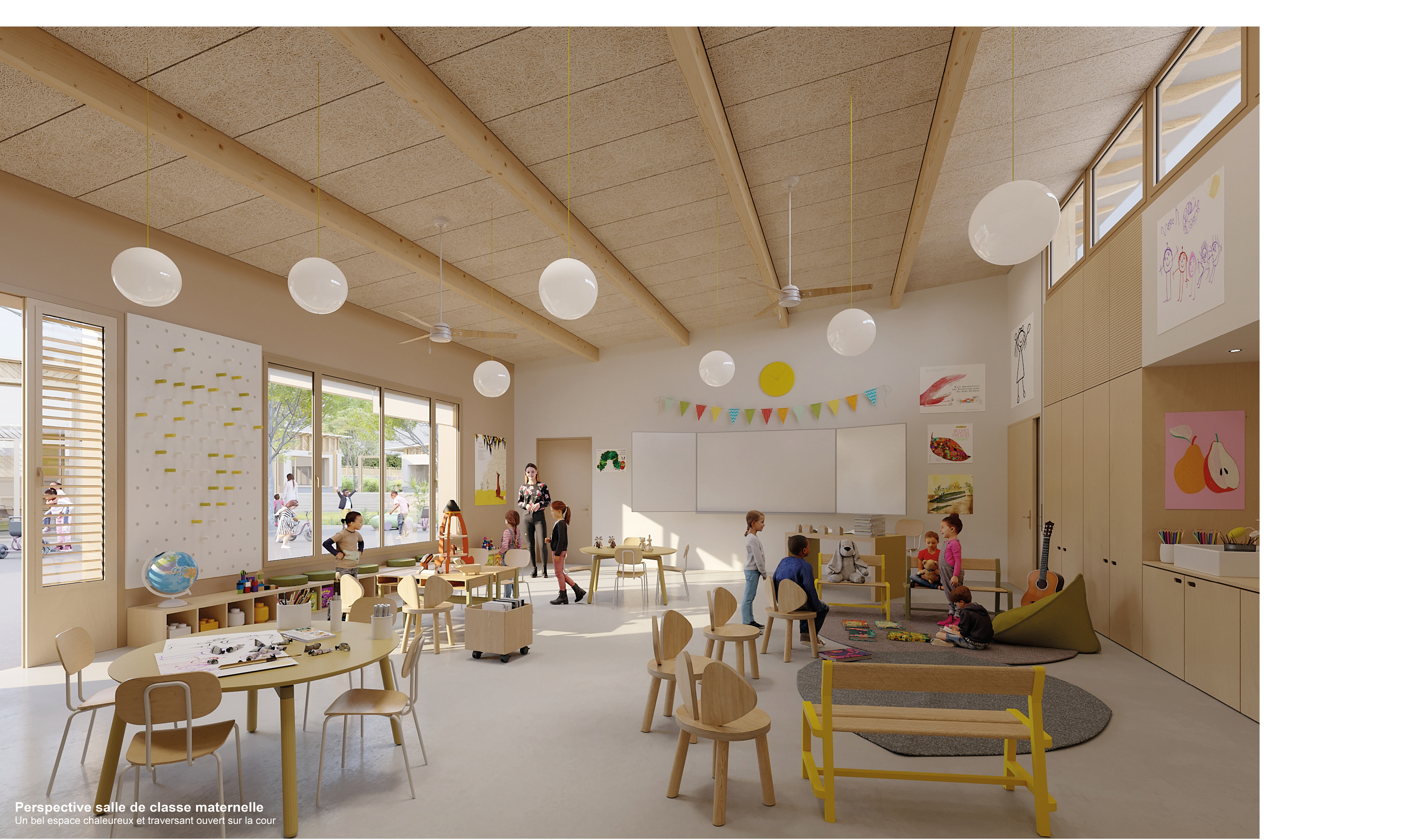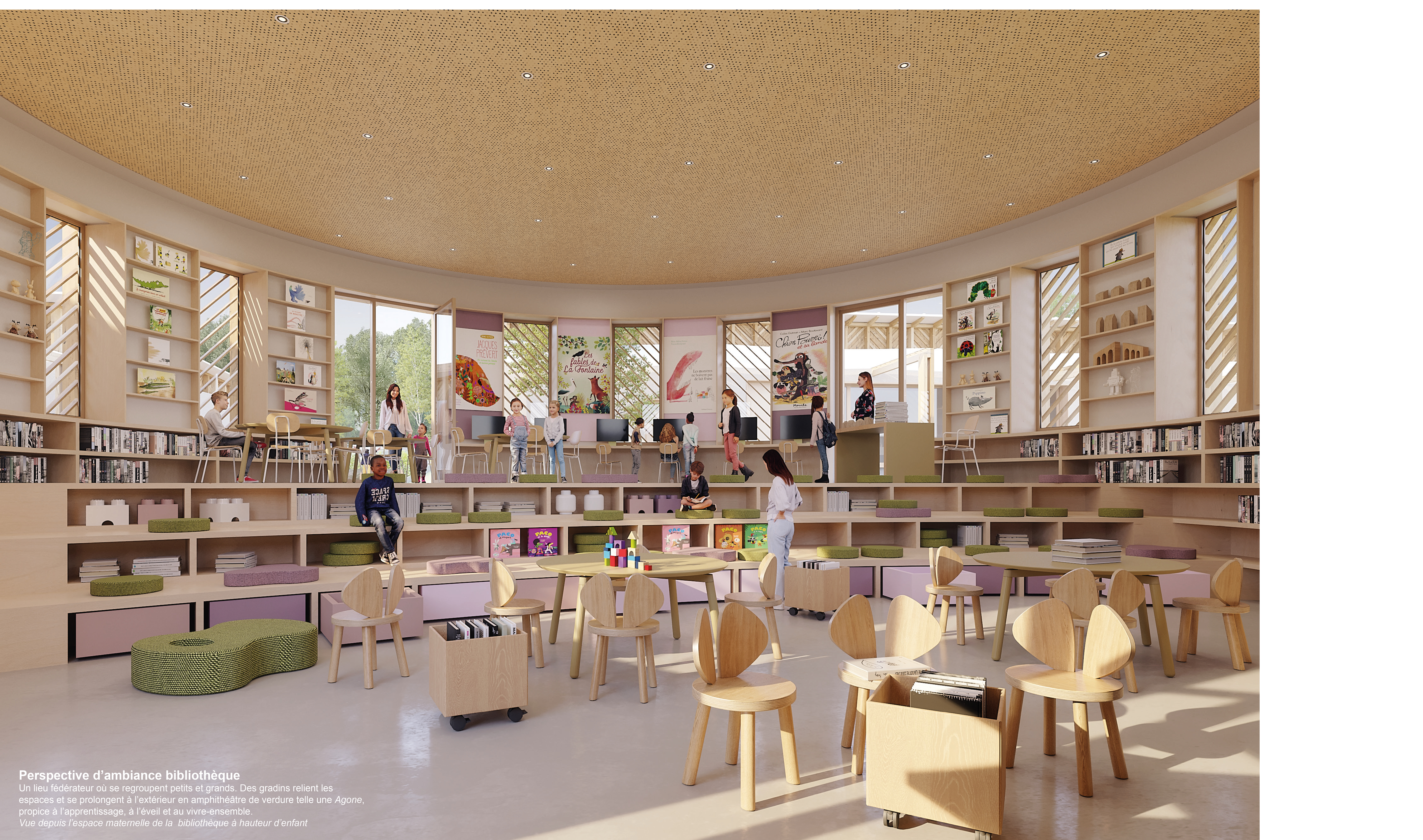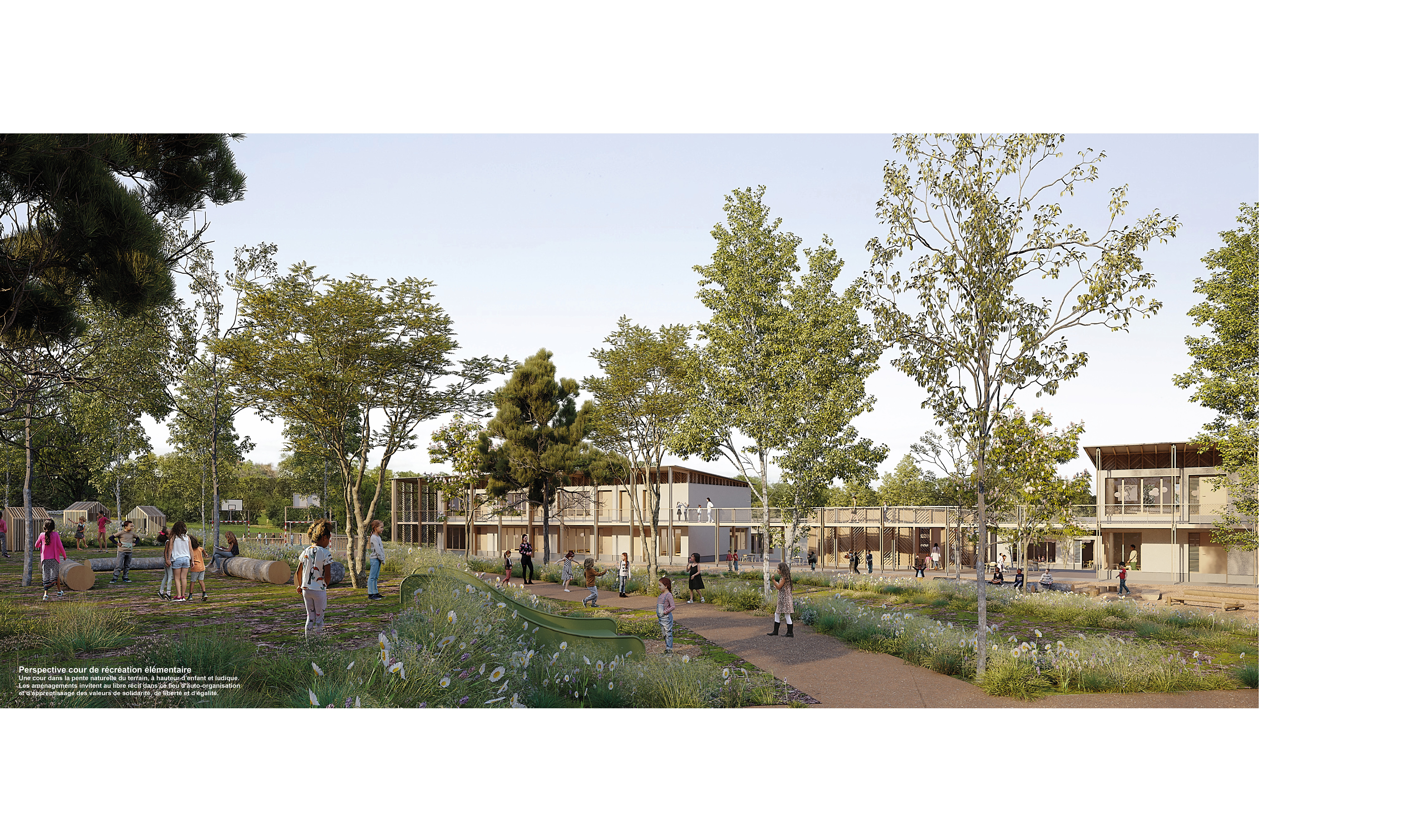 Ainsi, les élèves bénéficient d’une cour de récréation géante et naturelle, inscrite dans le terrain en pente. Au centre du domaine, la bibliothèque, telle une agone est accessible pendant les temps de récréation et tout au long de la journée.
