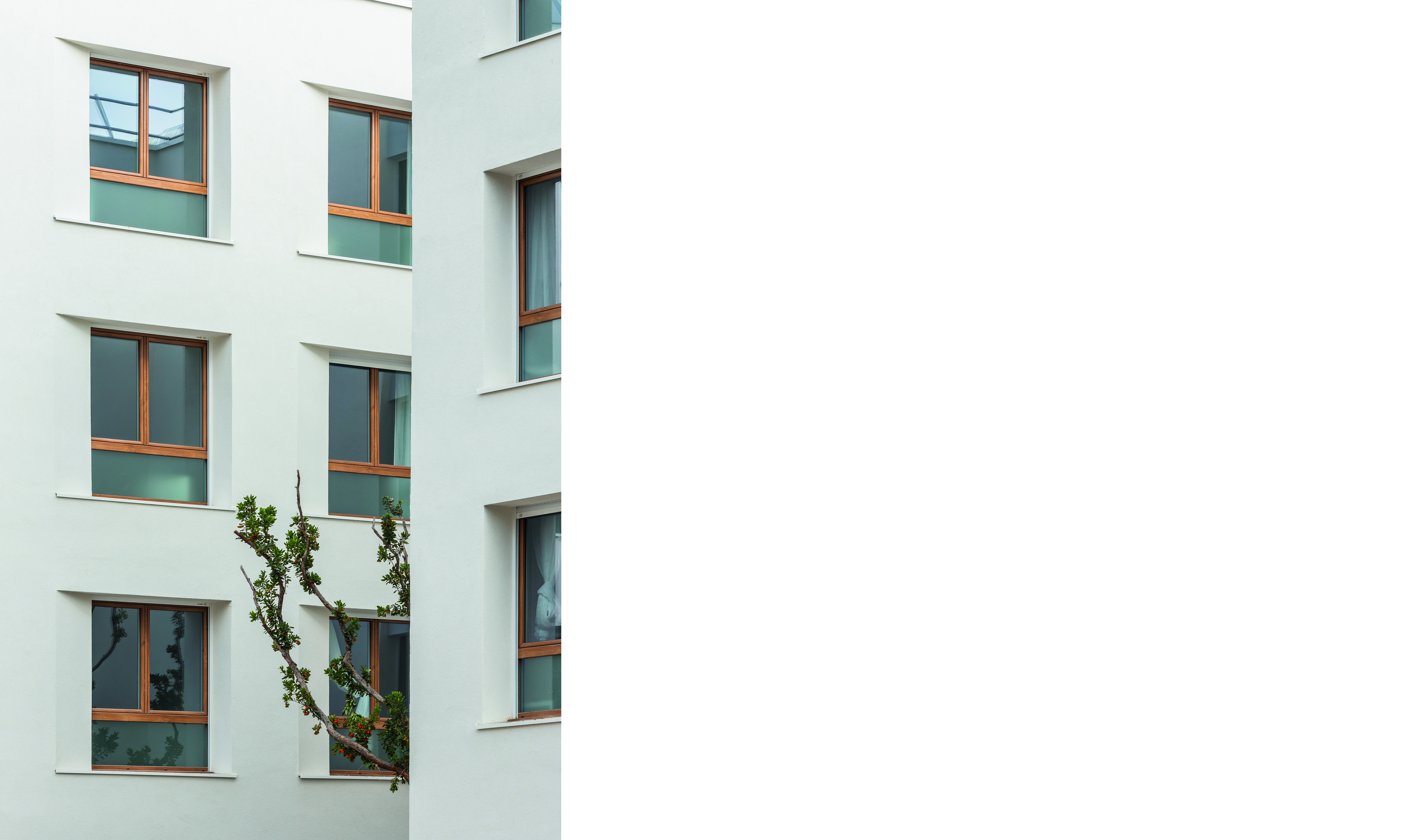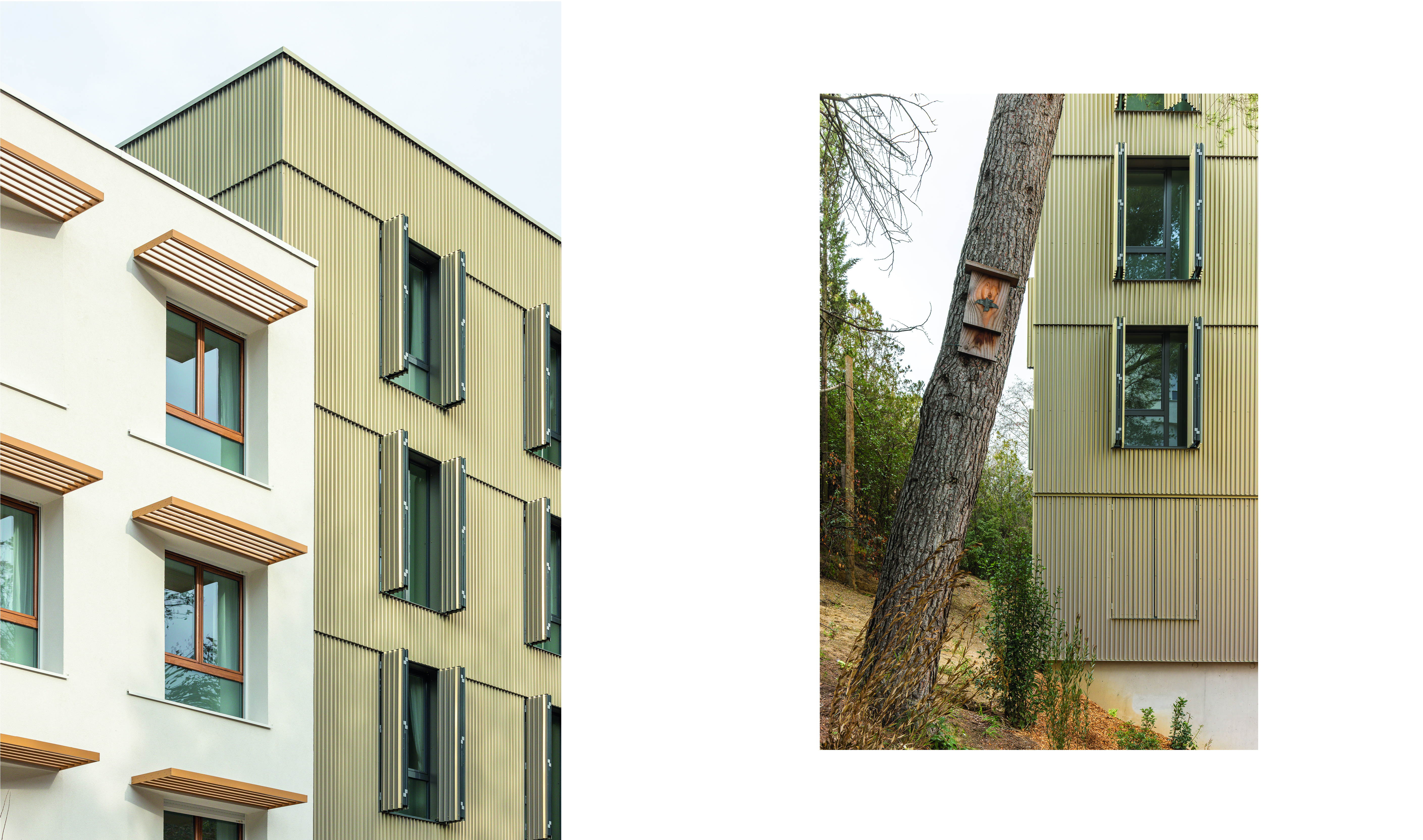 L’atmosphère du jardin autour du projet est visuellement profitable depuis les rues, ainsi ce recul permet d’éloigner les logements des nuisances sonores de l’Avenue et d’y aménager l’ensemble des espaces extérieurs collectifs demandés au programme. Pour s’insérer dans le tissu urbain existant de la manière la plus sensible, le projet met en avant une composition de façade volontairement tramée et un style architectural respectueux de l’identité du quartier. Le dessin des façade du bâtiment principal intègre de nombreuses variations qui ont pour objectif de fragmenter les dimensions générales perçues du projet. Il