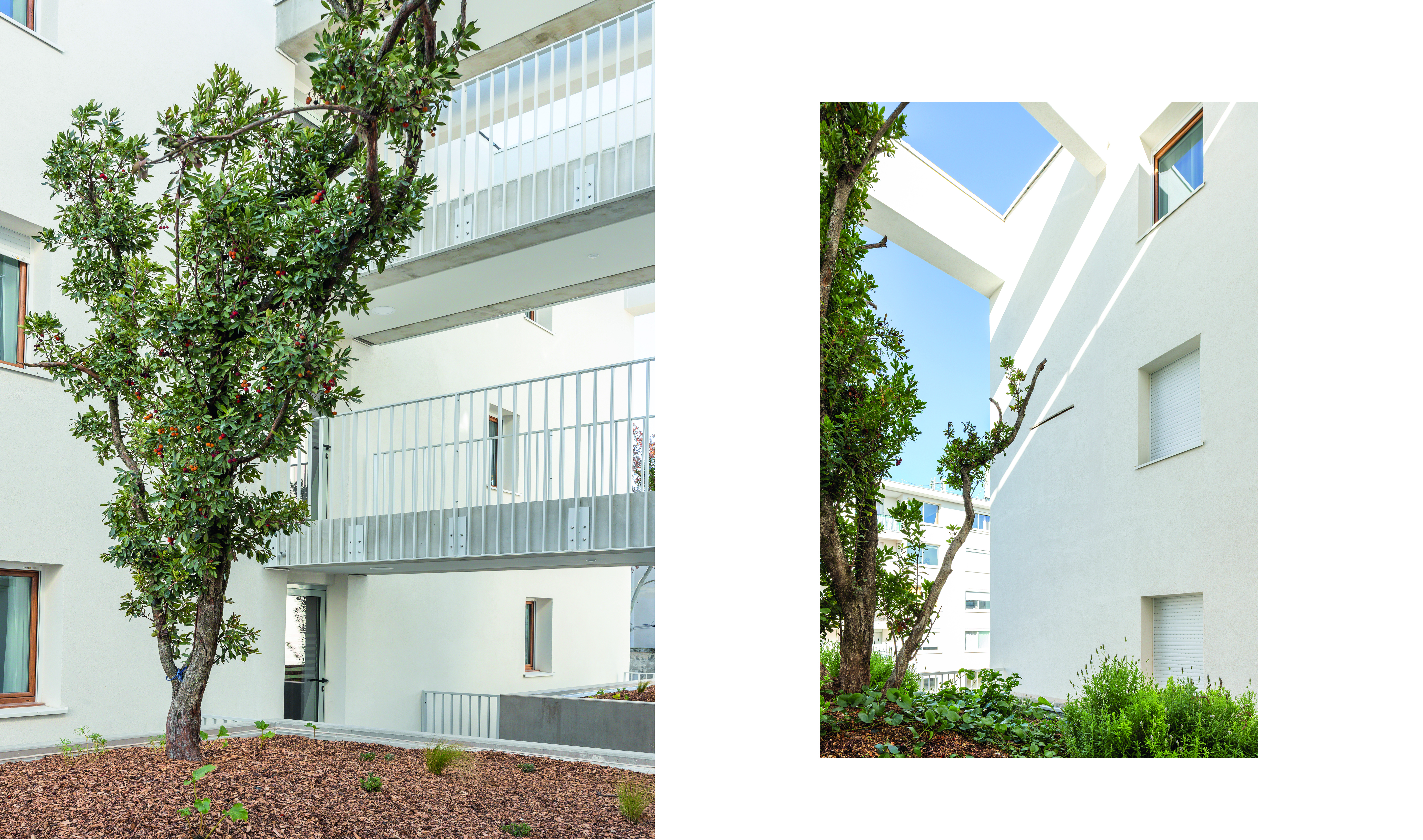 Dans la lecture horizontale, le dessin d’architecture du projet introduit plusieurs ruptures. Des grandes percées sous forme de patios d’étage participe à la fragmentation de la volumétrie globale du projet. Des grands arbres en bacs occupent ces espaces.