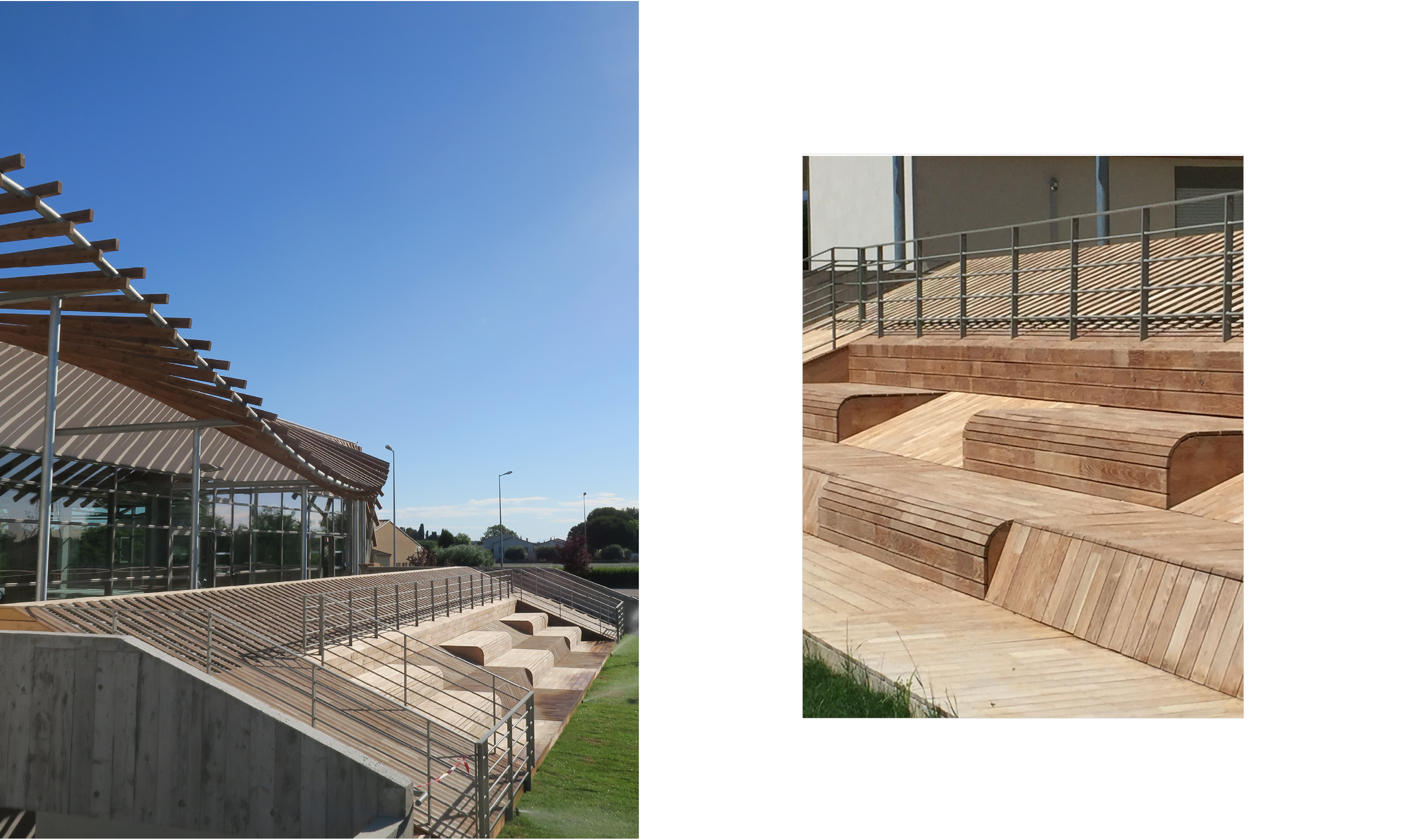 « Renverser la vapeur ! », tel était l’enjeu du projet, faire de la contrainte un atout de projet. Ainsi les locaux techniques et les accès parking sont venus se nicher sous un grand socle aux multiples usages . Cet escalier-gradin, objet hybride est un point d’arrêt, où «farniente», rencontres et discussions sont à l’honneur. Ludique et pratique, il fait office de solarium et articule la liaison entre les différents niveaux : plages enherbées et bassins. Ce socle technique, devenu promontoire permet depuis les bassins d’ouvrir la vue sur le grand paysage.