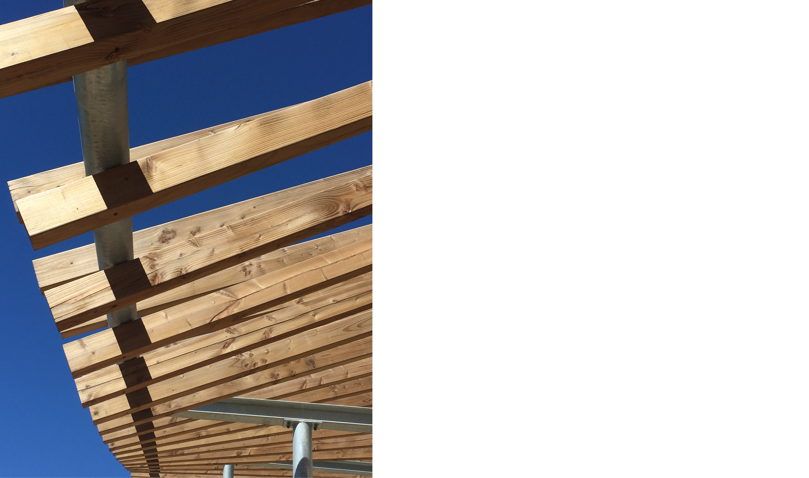 En extérieur, la belle se coiffe d’une mantille bois et métal qui se déploie et donne la dynamique. La structure s’étire et se plie, elle oscille avec souplesse et protège les façades les plus exposées; la géante capture la lumière !
