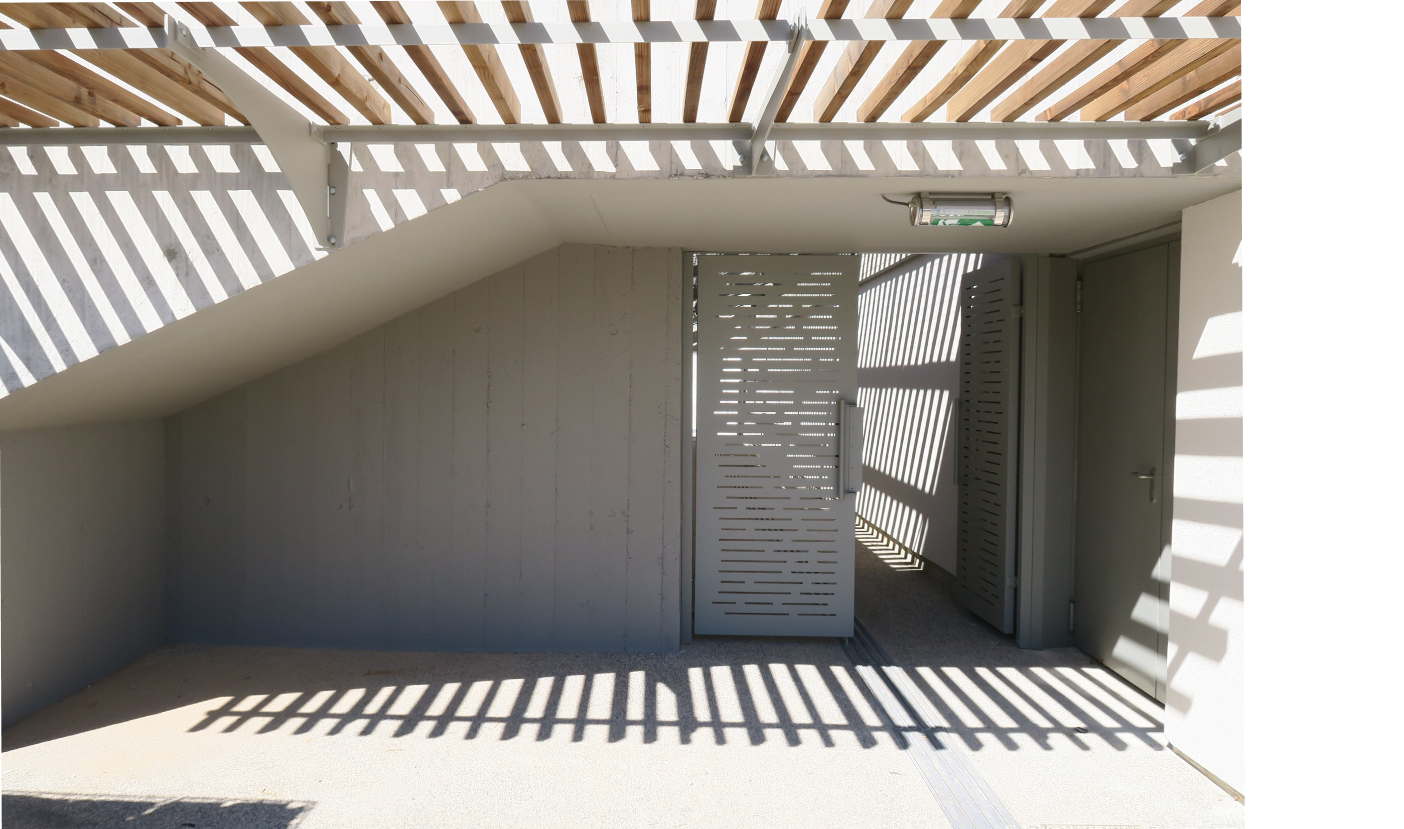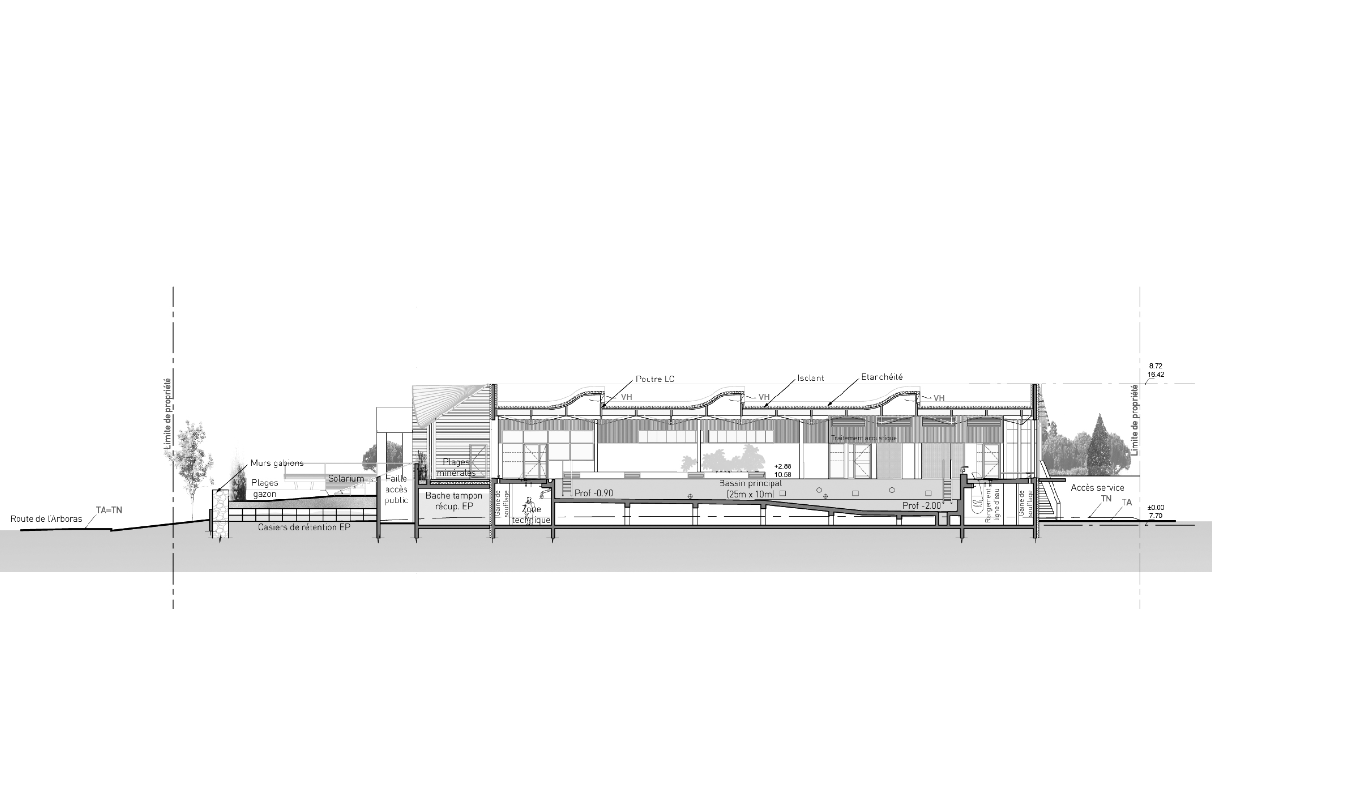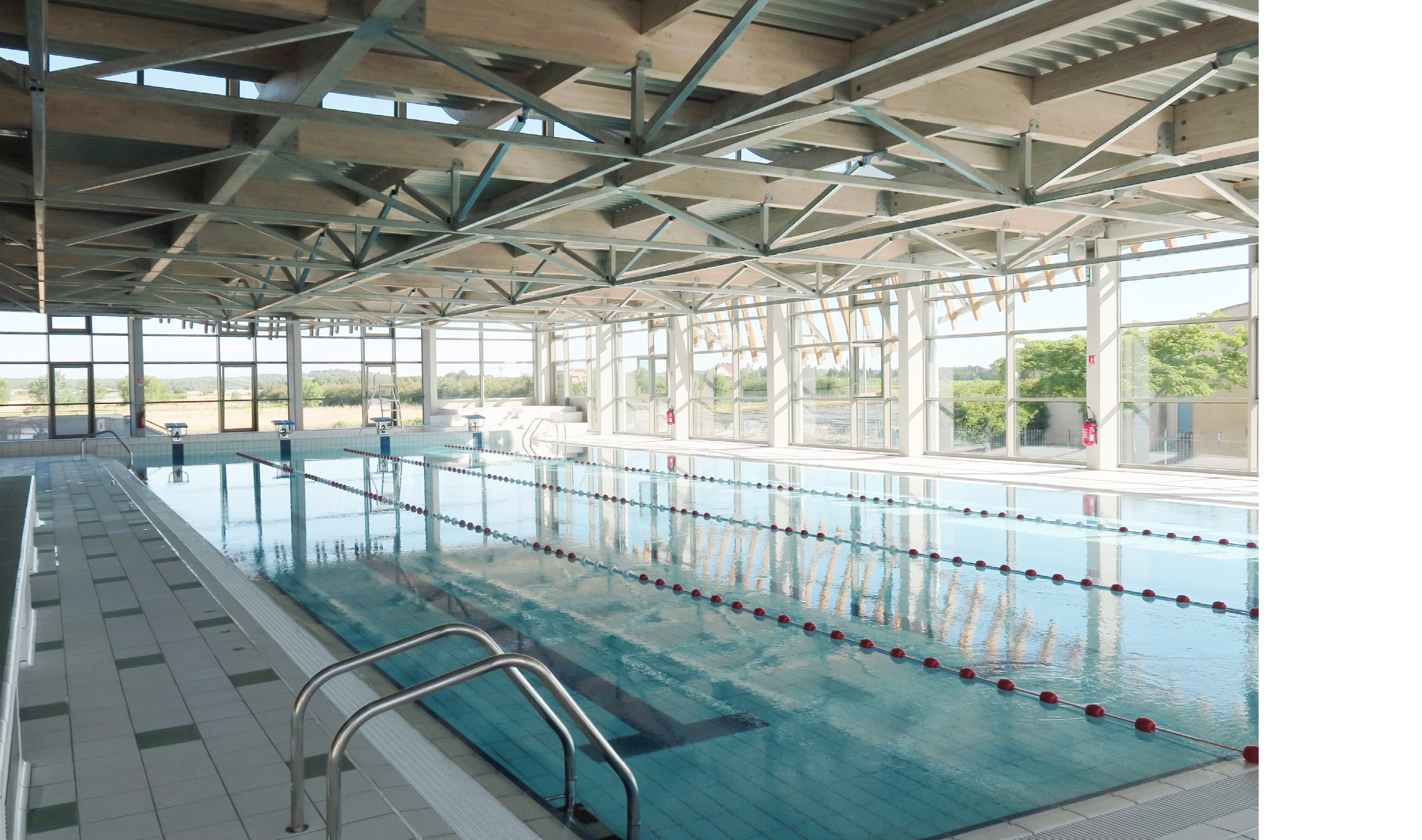 Le bâtiment s’intègre à l’environnement, il est traversé par la lumière et l’œil file. En toiture la structure en caissons de bois laméllé-collé permet d’inscrire le bâtiment dans les limites de hauteur autorisées par le PLU. Des sheds de lumières orientés nord rythment la sous-face et apporte un ensoleillement adapté à la pratique du lieu. Au sud, des sheds baignent de lumière les bassins ludiques.