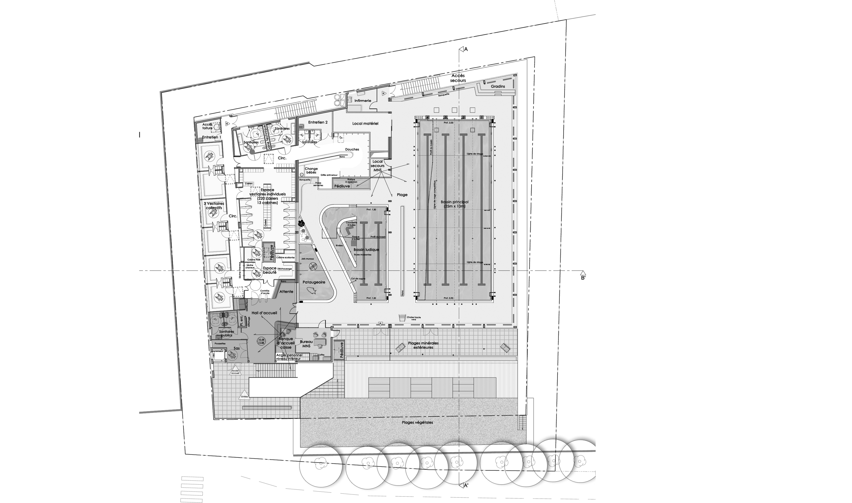 Bassin sportif de 25m, 2 bassins ludiques, plages extérieurs bois, rdc technique